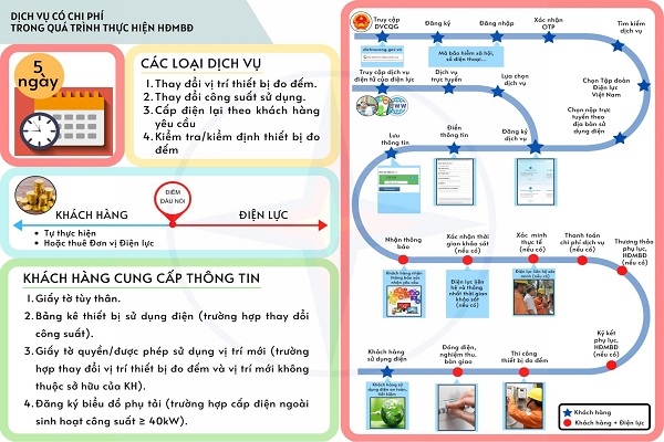 Đối với dịch vụ cấp điện hạ áp không còn quy định riêng thời gian cung cấp dịch vụ cấp mới theo khu vực và loại khách hàng (Sinh hoạt, Ngoài sinh hoạt) mà quy định chung thời gian dịch vụ cấp điện mới hạ áp là không quá 5 ngày làm việc. Trường hợp phải lắp dựng thêm cột/cáp ngầm/ lắp đặt máy biến dòng điện không quá 7 ngày làm việc. Đối với các dịch vụ trong quá trình thực hiện HĐMBĐ: Quy định thống nhất thời gian tiếp nhận, giải quyết yêu cầu đối với các dịch vụ miễn phí là không quá 3 ngày làm việc, đối với dịch vụ có chi phí là không quá 5 ngày làm việc. Trường hợp phải kiểm tra thiết bị đo đếm không quá 3 ngày làm việc.