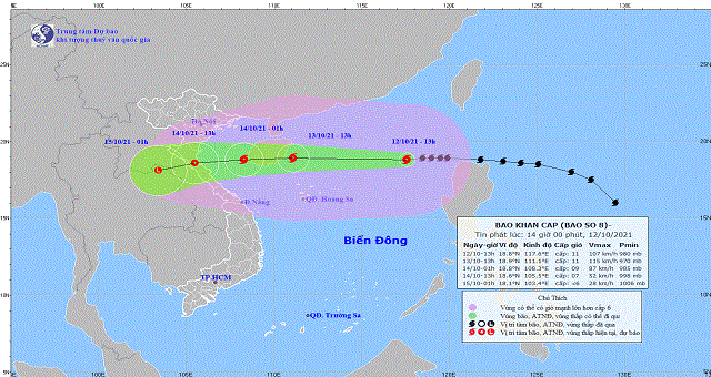 Dự báo trong 24 giờ tới, bão di chuyển nhanh theo hướng Tây, mỗi giờ đi được 25-30km và có khả năng mạnh thêm. Đến 13 giờ ngày 13/10, vị trí tâm bão ở khoảng 18,9 độ Vĩ Bắc; 111,1 độ Kinh Đông, ngay trên vùng biển phía Đông đảo Hải Nam (Trung Quốc). Sức gió mạnh nhất vùng gần tâm bão mạnh cấp 11 (100-120km/giờ), giật cấp 14.