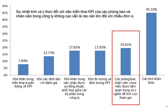 Trên đây là những rào cản khi doanh nghiệp đưa ra quyết định có triển khai KPI hay không. Đến khi triển khai KPI thì các doanh nghiệp cũng gặp phải không ít những khó khăn (hình minh họa). Căn cứ trên dữ liệu do nhóm HRA (thành viên hiệp hội nhân sự) thực hiện cho thấy các vấn đề gặp phải khi triển khai KPI tại doanh nghiệp có từ 100-300 nhân viên đó là: